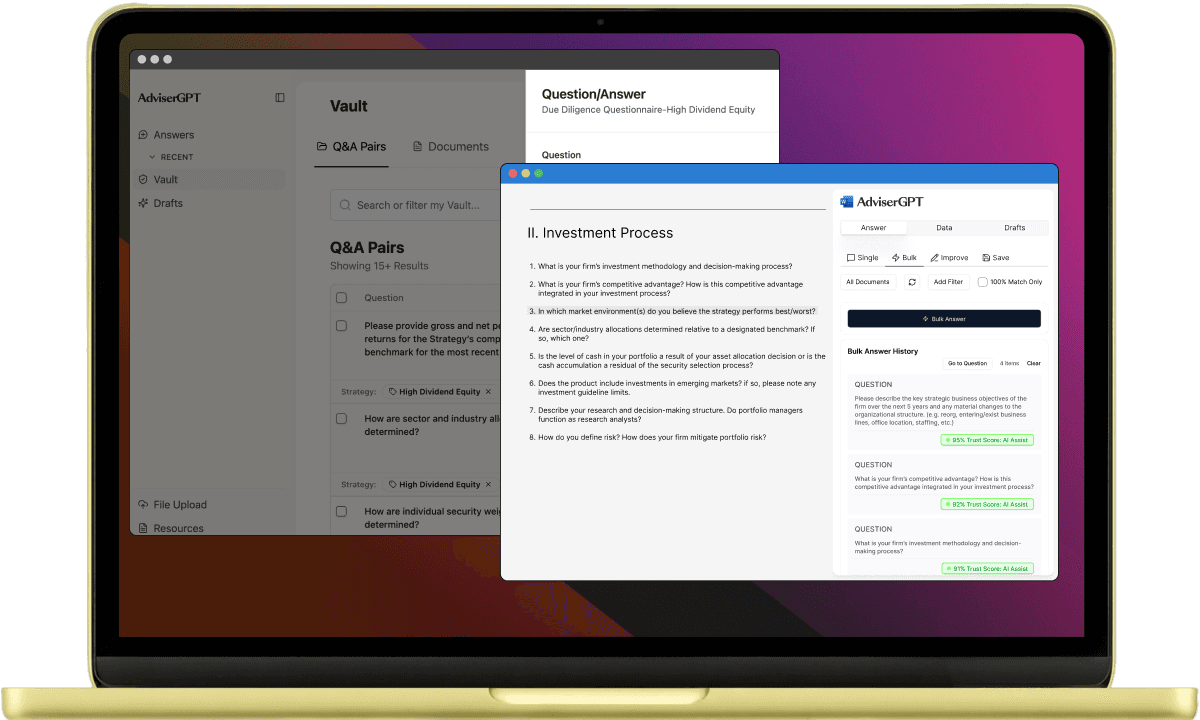 AdviserGPT is an advanced AI assistant built for investment managers. It streamlines RFPs, DDQs, and client inquiries with intelligent automation while ensuring compliance and preserving your firm's distinct voice and expertise.